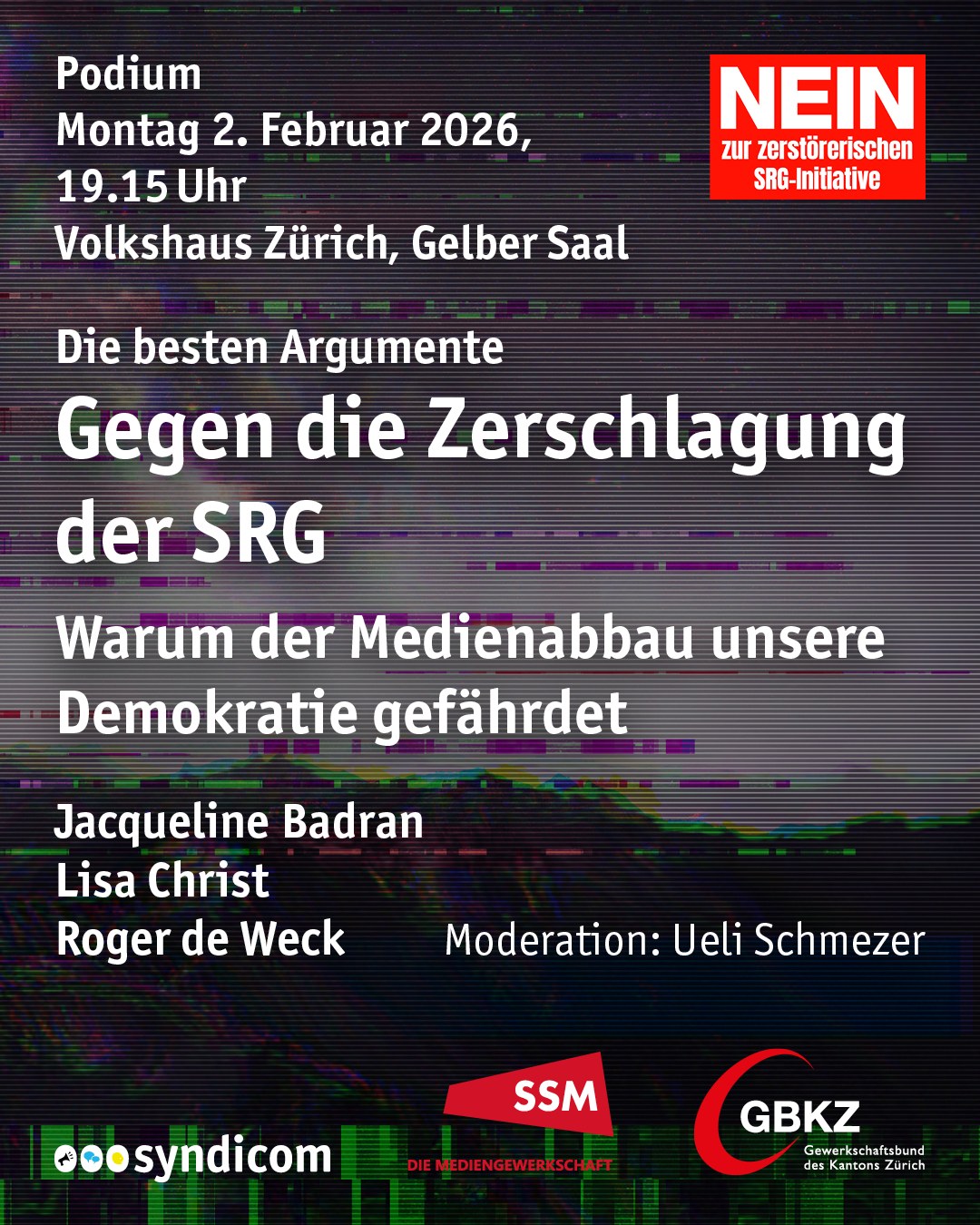 Am Montag, 2. Februar, findet in Zürich ein Podiumsgespräch statt. Mit dabei sind Jacqueline Badran, Lisa Christ und Roger de Weck. Sie zeigen auf, warum der Abbau der SRG unserer Demokratie schadet. ➜ Mehr Infos hier auf dem Flyer (Keine Anmeldung nötig.)