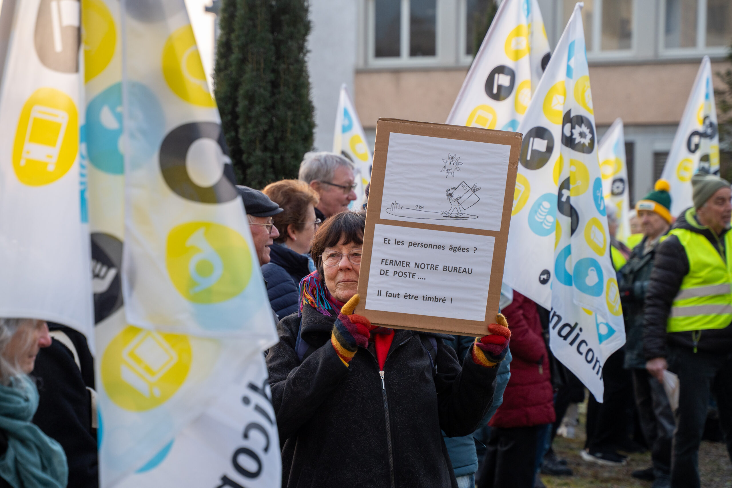 À l’appel de syndicom, quelque 150 personnes ont dénoncé la réduction du réseau postal dans le canton du Jura. Devant le Parlement jurassien à Delémont, le syndicat a encouragé les communes et la population à s’opposer à cette mesure.