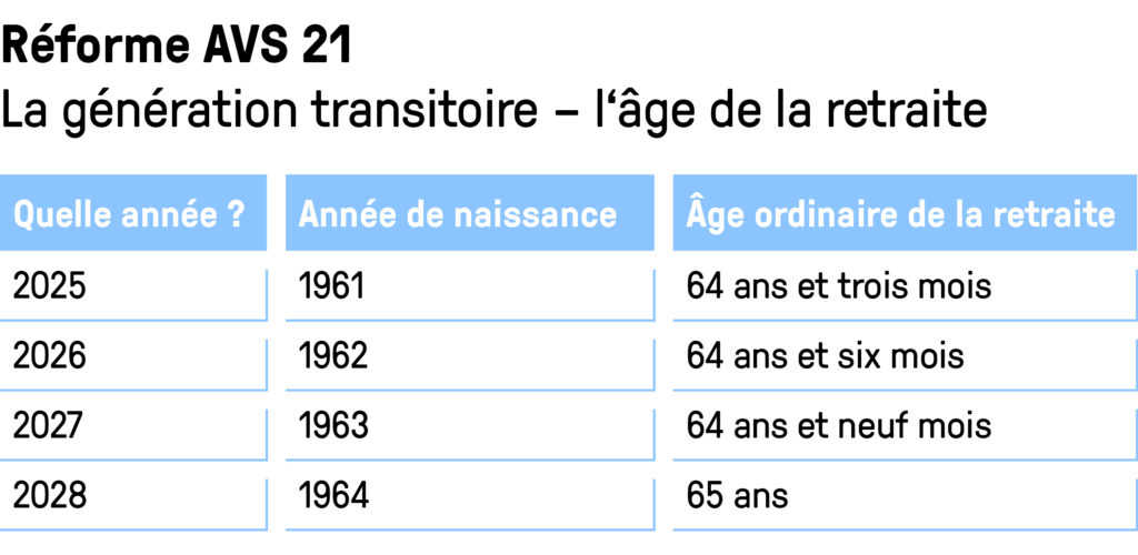 Oui, la réforme AVS 21 prévoit un supplément de rente attribué uniquement aux femmes nées entre 1961 et 1969, lorsque leurs revenus sont modestes et lorsqu’elles prennent leur retraite à l’âge de référence. C’est une mesurette qui vise à faire passer la pilule : la génération transitoire (voir schéma) reçoit en effet un supplément qui s’échelonne entre 12,50 francs et 160 francs par mois.