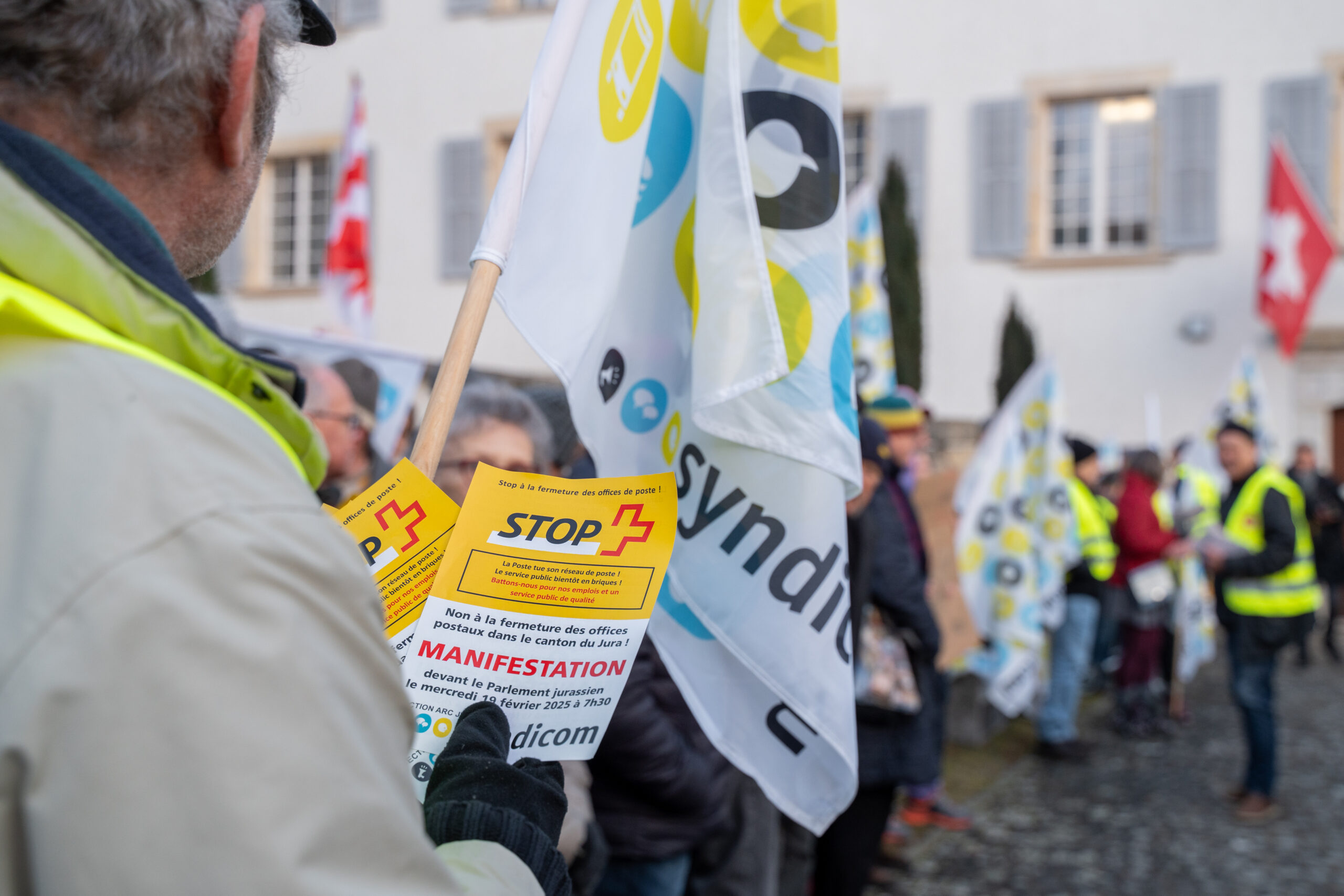 Rund 150 Personen protestierten am 19. Februar mit syndicom gegen den Abbau des Poststellennetzes im Kanton Jura. Vor dem jurassischen Parlament in Delémont rief die Gewerkschaft die Gemeinden und die Bevölkerung direkt auf, sich gegen die Schliessungen zu wehren.